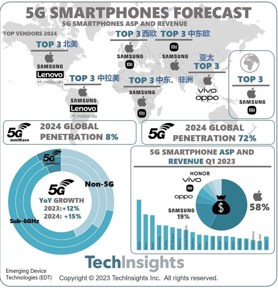5G線路板廠了解到,研究機(jī)構(gòu)TechInsights近日發(fā)布報(bào)告,表示2024年5G智能手機(jī)滲透率預(yù)計(jì)將增長(zhǎng)至72%。2023年上半年智能手機(jī)市場(chǎng)不景氣,許多品牌一季度銷量同比有兩位數(shù)的下跌,不過隨著消費(fèi)回暖,預(yù)計(jì)5G智能手機(jī)市場(chǎng)將在今年年底和2024年恢復(fù)兩位數(shù)的增長(zhǎng)。