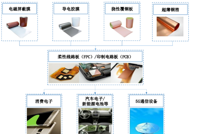 撓性覆銅板是FPC的加工基材,由撓性絕緣層與金屬箔組成,是FPC的核心原材料。超薄銅箔是滿足高要求PCB的重要材料。