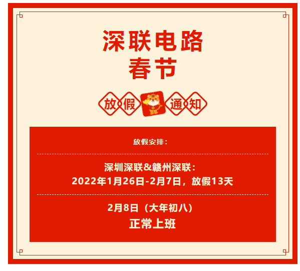 深聯(lián)電路柔性電路板廠2022年春節(jié)放假安排立馬就給大家放出來了!