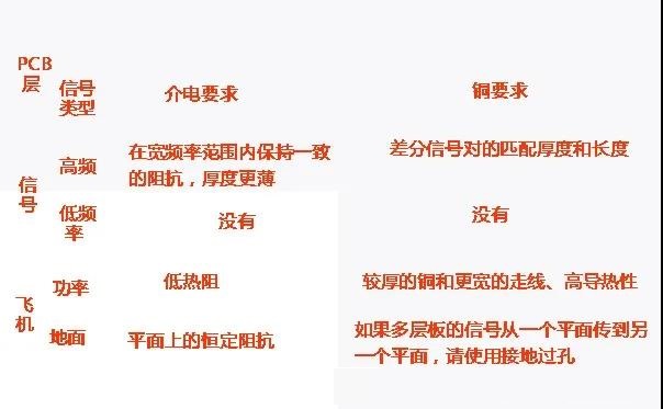 PCB層的主要材料考慮是電介質(zhì)和銅。介電材料在相鄰層上的不同信號(hào)類型之間提供隔離。這也是決定線路板電阻率的主要因素。該層的表面銅定義了跟蹤電流容量、電阻和損耗。銅的重量或厚度用于確保足夠的電流。與銅的重量密切相關(guān)的是跟蹤寬度和長(zhǎng)度,用于指定每個(gè)信號(hào)路徑的物理空間。對(duì)于高頻交流信號(hào),跡線匹配(長(zhǎng)度和寬度)對(duì)于信號(hào)完整性非常重要,而對(duì)于電源和接地信號(hào),最小化損耗(對(duì)應(yīng)于較短的跡線)非常重要。下表總結(jié)了設(shè)計(jì)PCB層時(shí)應(yīng)考慮的設(shè)計(jì)要求。