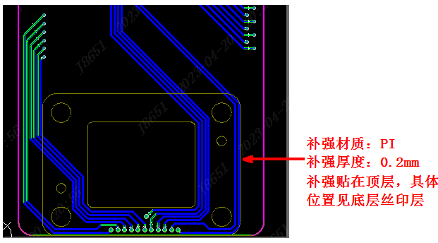 補強三要素:材質(zhì)、厚度、層別區(qū)域,需明確標(biāo)示出來,建議補強區(qū)域設(shè)計在底層絲印層,并截圖說明,下單時將圖片與做板文件一起打包上傳。舉例如下: