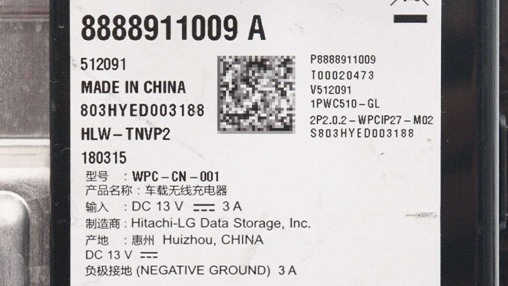 模塊上貼有無線充電信息貼紙,產(chǎn)地在中國(guó)惠州,型號(hào)是WPC-CN-001,輸入規(guī)格為直流13V3A,由日立樂金光科技惠州公司生產(chǎn)。