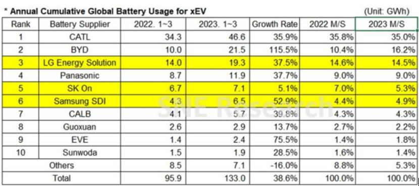 PCB廠深深看到,LG Energy Solution今年一季度動力電池安裝量為19.3GWh,同比增長37.5%。以14.5%的份額排名世界第三,低于一年前的14.6%。據(jù)SNE research分析,比亞迪電池裝車量的爆發(fā)性增長,是得益于比亞迪元、漢、秦Plus系列去年在中國市場的高銷售量,而LG新能源則仰賴于特斯拉車型3/Y、大眾ID.4、福特Mustang Mach-E的銷售利好。根據(jù)比亞迪2023年一季度的最新業(yè)績,比亞迪實現(xiàn)了新能源汽車產(chǎn)品和動力電池產(chǎn)品在增速和市占率兩方面的雙重提升。