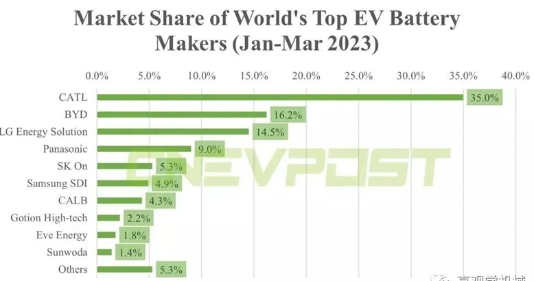 在全球電動汽車電池供應(yīng)商榜單中,中國的寧德時代和比亞迪包攬冠亞軍,合計市占份額超過50%,兩家中國企業(yè)繼續(xù)占據(jù)全球動力電池裝車量的半壁江山。