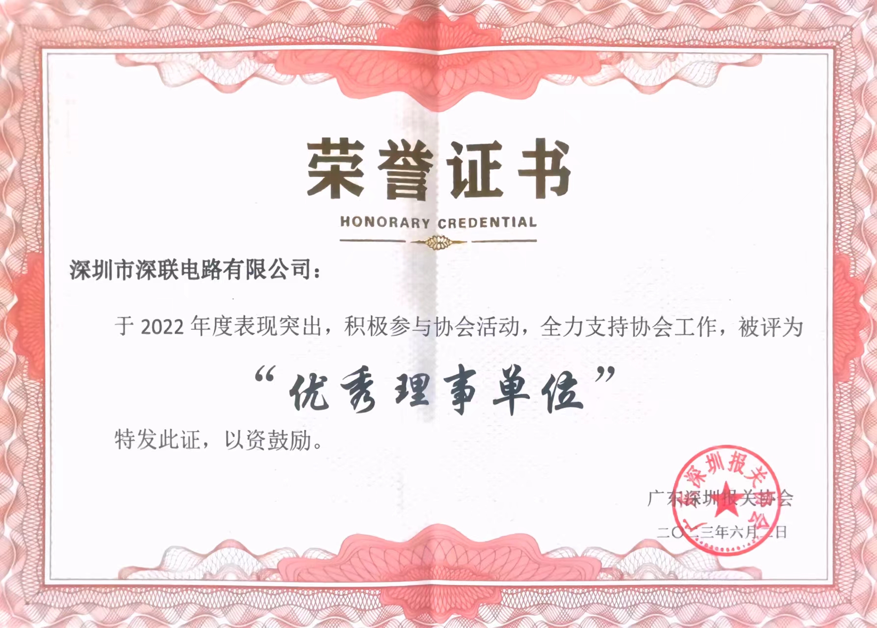 我司線路板廠為更好的響應(yīng)配合海關(guān)進(jìn)出口貿(mào)易政策和制度,給廣大客戶帶來(lái)更優(yōu)質(zhì)的服務(wù)和利益,一直致力于報(bào)關(guān)協(xié)會(huì)會(huì)員單位的申請(qǐng)。經(jīng)過(guò)對(duì)公司業(yè)務(wù)模式、經(jīng)營(yíng)管理模式的改革和提升, 深聯(lián)電路在廣州深圳眾多家優(yōu)秀企業(yè)中,經(jīng)過(guò)層層審批,最終在2014年成為先進(jìn)理事,并于2022 年成為優(yōu)秀理事單位。