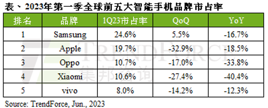受惠旗艦機(jī)Galaxy S23系列上市,三星(Samsung)第一季智能手機(jī)產(chǎn)量達(dá)6,150萬支,環(huán)比增長5.5%,第二季由于新機(jī)上市的熱度減退,預(yù)估第二季產(chǎn)量環(huán)比衰退近10%。蘋果(Apple)第一季智能手機(jī)產(chǎn)量共計(jì)5,330萬支,環(huán)比減少32.9%,其中iPhone 14系列新機(jī)生產(chǎn)比重約78%,優(yōu)于去年同期,展望第二季,由于是新舊機(jī)種交接的過渡期,預(yù)估產(chǎn)量將環(huán)比減少約20%。