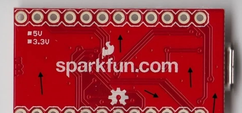 將復(fù)位焊盤連接到板上其他地方的小跡線。更大、更粗的跡線連接到5V電源引腳