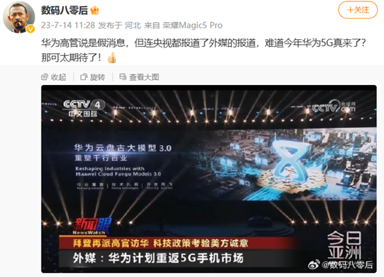 無獨(dú)有偶,博主@數(shù)碼八零后表示,華為高管說是假消息,但連央視都報(bào)道了外媒的報(bào)道,難道今年華為5G真來了?