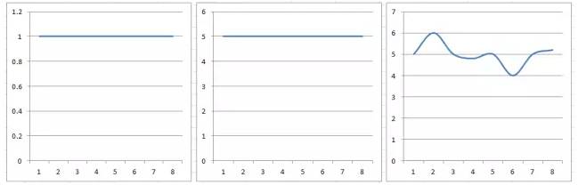 如果一個放大倍數(shù)為5的放大器,輸入恒定的1V電壓(波形如下左圖),則輸出應(yīng)該始終是5V(波形如下中圖),既不會隨時間改變,也不會隨溫度而變化,輸出和輸入的電壓形狀完全一樣。但如果放大倍數(shù)不穩(wěn)定,不斷變化,原先輸入的信號就會變形(如下右圖),信號可能由一條水平直線變成了一條曲線。這種波形變化叫做失真。