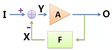 方框F是反饋器件,表示從輸出O取出信號,并將其與F相乘,得到 X ,所以 X=0*F ,這里 F<1 (這個部分在實(shí)際電路中可以用電阻實(shí)現(xiàn));