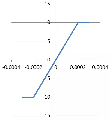 運(yùn)放開環(huán)增益A常常高達(dá)幾十萬~幾百萬,但運(yùn)放的輸出電壓受電源電壓限制,不能超出電源電壓。于是運(yùn)放的輸入-輸出關(guān)系類似下圖形狀。