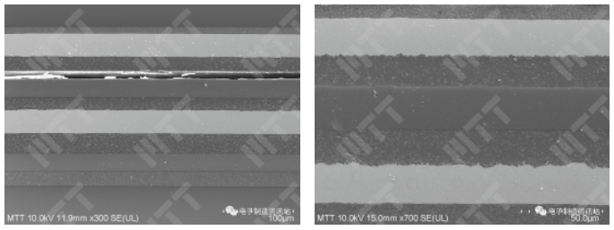 失效FPC鼓包位置切片后,均發(fā)現(xiàn)界面分離現(xiàn)象,分離位于粘合劑與PI膜之間;OK FPC切片后均未發(fā)現(xiàn)界面分層現(xiàn)象。