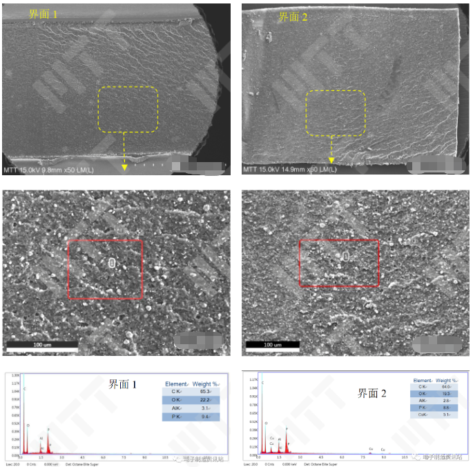 OK FPC半成品:分離界面位于粘合劑內(nèi)部;分離界面粗糙,可見明顯粘結(jié)特征;分離界面未見明顯異物殘留痕跡,界面一側(cè)探測到C、N、O、Al、P元素,另一側(cè)探測到C、N、O、Al、P、Cu元素。