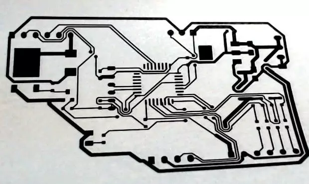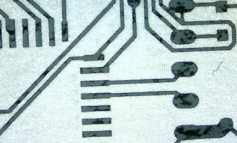 然后將其附著在一塊大小合適的覆銅板上,在熱轉(zhuǎn)印機(jī)加熱加壓下,20秒便可以完成熱轉(zhuǎn)印。取出覆銅板,揭開熱轉(zhuǎn)印紙,便可以看到覆銅板上清晰的線路圖。