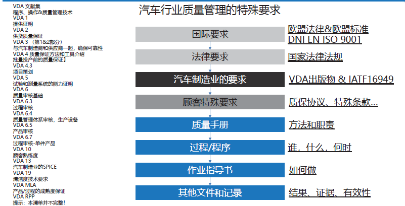 VDA6.3是德國汽車工業(yè)聯(lián)合會(VDA)制定的德國汽車工業(yè)質(zhì)量標(biāo)準(zhǔn)的第三部分,即過程審核,簡稱VDA6.3,過程審核是指對質(zhì)量能力進(jìn)行評定,使過程能達(dá)到受控和有能力,能在各種干擾因素的影響下穩(wěn)定受控。