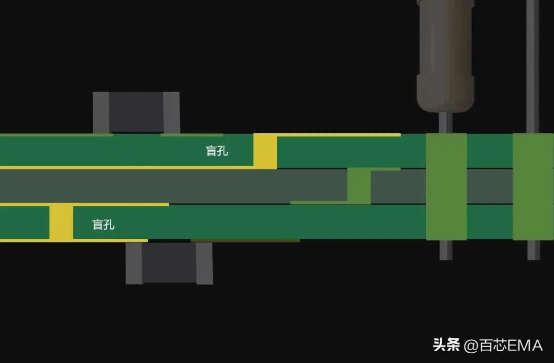 盲孔與通孔類似,但是盲孔只有部分穿過PCB,將外層銅層連接到內(nèi)部,而不會穿過PCB,盲孔非常適合空間有限的多層PCB。