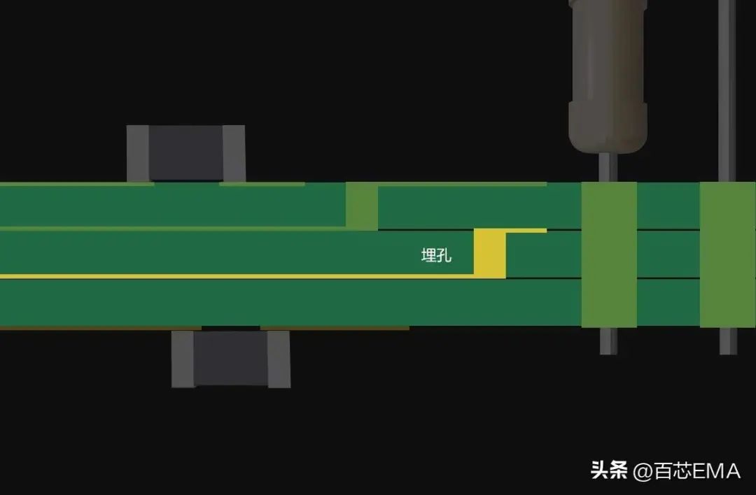 埋孔完全隱藏在PCB的各層內(nèi)部,連接PCB的2個或者多個內(nèi)部銅層。非常適合空間限制比較高的高密度PCB。