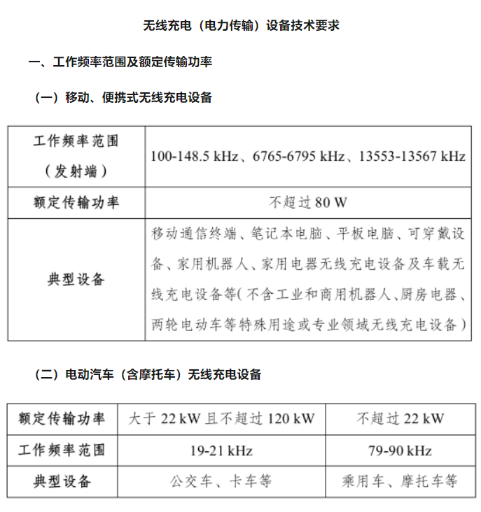 2021年,工信部發(fā)布了一份《無(wú)線充電(電力傳輸)設(shè)備無(wú)線電管理暫行規(guī)定(征求意見稿)》(簡(jiǎn)稱《規(guī)定》),其中第四條明確表示:移動(dòng)和便攜式無(wú)線充電設(shè)備應(yīng)當(dāng)工作在100-148.5kHz、6765-6795kHz、13553-13567kHz頻段,且額定傳輸功不超過(guò)50W。