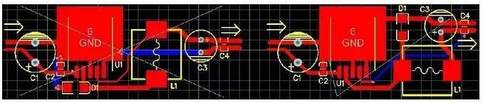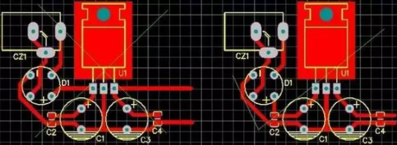 圖2是上面原理圖的PCB圖,兩個(gè)圖相似。左圖和右圖就是走線(xiàn)有點(diǎn)不一樣,左圖的電源經(jīng)整流后直接就到了穩(wěn)壓芯片的輸入腳了,然后才是穩(wěn)壓電容,這里電容所起的濾波效果就差了很多,輸出也有問(wèn)題。右圖就是比較好的圖了。我們不僅要考慮正電源的流向問(wèn)題,還必須考慮地回流問(wèn)題,一般來(lái)說(shuō),正電源線(xiàn)和地回流線(xiàn)要盡可能同進(jìn)同出,彼此離近點(diǎn)。