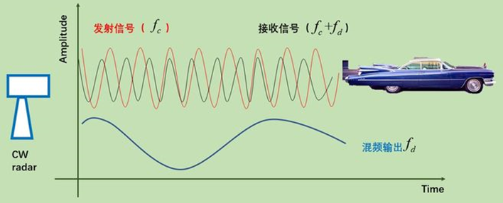 CW恒頻連續(xù)波雷達(dá)工作原理:對接收信號與發(fā)射信號的混頻可以得到目標(biāo)的多普勒頻率進(jìn)而得到速度信息。但是由于是連續(xù)波,不能測得發(fā)射信號的來回時間。因此CW雷達(dá)不能進(jìn)行距離測量,只能實(shí)現(xiàn)對目標(biāo)的速度測量。