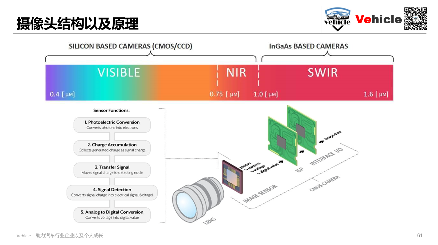 當(dāng)前攝像頭傳感器主要有CMOS 和CCD, CCD 相對于 CMOS 的優(yōu)勢在于其高感光度,高像素,高功耗為代價(jià)獲得更好的圖像質(zhì)量,所以一般用在單反相機(jī),而高功耗會導(dǎo)致熱量問題和更高的價(jià)格,另外CMOS讀取速度快,成本低所以當(dāng)前車載攝像頭都采用CMOS。另外還有夜視 (NV) 或高動態(tài)范圍 (HDR) 等對光高度敏感的專用芯片。