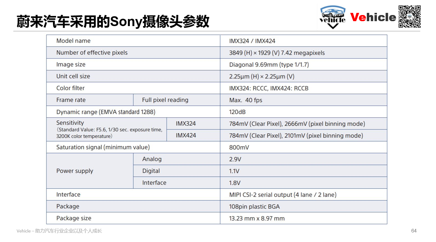 一般去選擇或者判斷攝像頭,都會考慮攝像頭的參數(shù)和配置,上圖為Sony車載攝像頭的參數(shù),應(yīng)該是蔚來汽車要采用的8Mp攝像頭參數(shù)配置,上圖中參數(shù)拋開由鏡頭決定的視場角(FOV)和電源信息,車載傳感器一般會有這些指標(biāo):