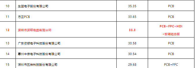 2022年度中國電路(CPCA)百強排行深聯(lián)電路排行12名!
