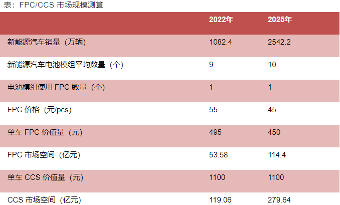 我們根據(jù)這一新能源汽車銷量預(yù)測(cè)數(shù)據(jù),對(duì) FPC/CCS 的市場(chǎng)空間進(jìn)行測(cè)算:
