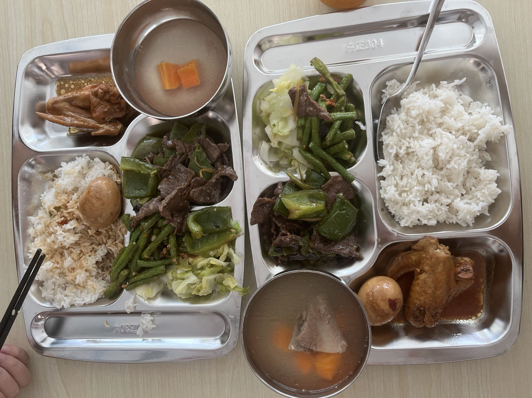 午餐時間到了,小王和其他同事們一起來到了工廠的食堂。4.5元的中餐,四菜一湯,雖然簡單,但卻讓小王吃出了家的味道。