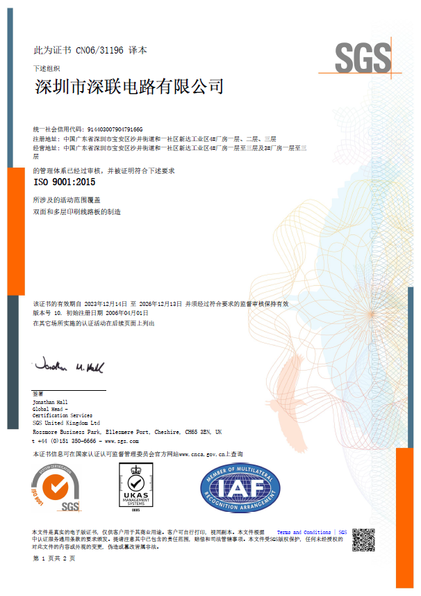 ISO9001認(rèn)證是國際上最成熟的質(zhì)量管理框架,為企業(yè)提供了一個有效的質(zhì)量管理體系標(biāo)準(zhǔn),有助于提升企業(yè)的質(zhì)量管理水平,增強線路板的競爭力。獲得此認(rèn)證能幫助PCB廠提升質(zhì)量管理水平,確保產(chǎn)品質(zhì)量的一致性和穩(wěn)定性,從而提升客戶滿意度和市場競爭力。