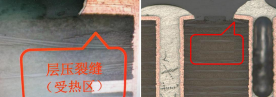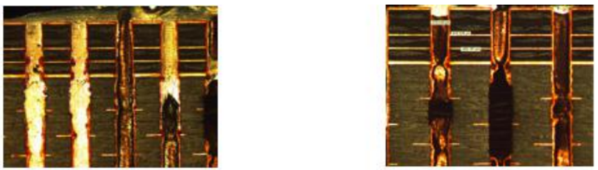 解決方案:高速發(fā)展是趨勢(shì),孔環(huán)會(huì)越來越小,為減少焊盤起翹或 PP 層開裂缺陷,需 要在樹脂流動(dòng)性和壓合工藝參數(shù)上進(jìn)行工藝優(yōu)化。