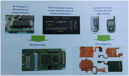 對于傳統(tǒng)的高信賴度應(yīng)用,如:軍事、航太、醫(yī)療方面,多數(shù)都比較常采用傳統(tǒng)的電路板結(jié)構(gòu)制作軟硬板。這些年來由于手持電子產(chǎn)品的需求大幅提升,因此如何增加構(gòu)裝密度與減少占據(jù)空間,就成為電子產(chǎn)品提升性能的重要手法。如圖1-3所示,為業(yè)者提升密度的概念示意。