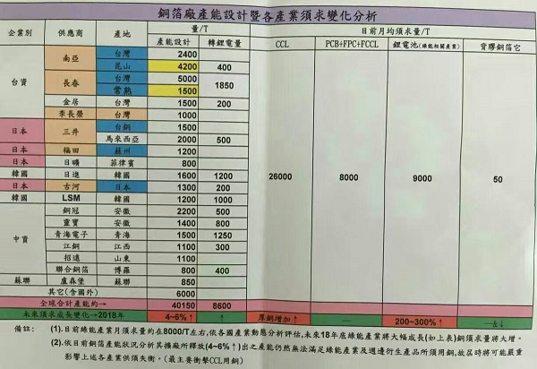 預(yù)計(jì)到2018年,鋰電池銅箔需求量大幅增加200%-300%,而銅箔產(chǎn)能擴(kuò)張速度4%-5%,無法滿足鋰電產(chǎn)業(yè)及周邊產(chǎn)品對(duì)于銅箔的需求,并將進(jìn)一步導(dǎo)致其他產(chǎn)業(yè),尤其CCL的銅箔供需失衡,進(jìn)而引起相應(yīng)銅箔供給價(jià)格上漲。