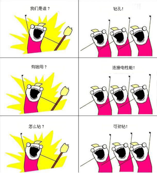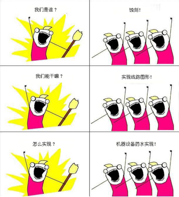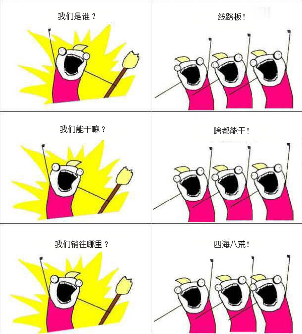 想必大家最近都被“我們是誰”刷屏了吧,這一漫畫原創(chuàng)作者是美國漫畫家艾麗·布羅什(Allie Brosh),2010年她發(fā)布了該漫畫,夸張簡單的繪畫風格很受好評。而此次火爆朋友圈的漫畫主角是艾麗·布羅什創(chuàng)作的漫畫形象跳跳魚小姐,艾麗·布羅什也將這些漫畫形象之間的故事匯集成書《Hyperbole a Half》出版,并得到比爾·蓋茨的推薦。這不,PCB廠生產(chǎn)部隊就表示不服,我們也要展示下!