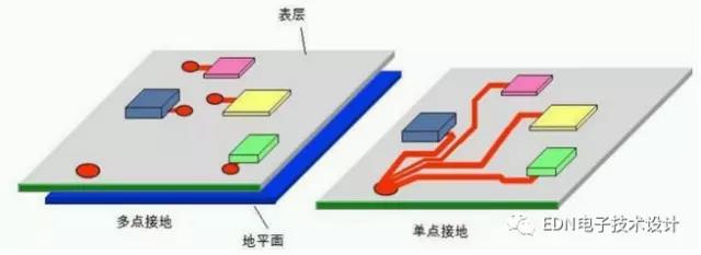 ① 單點接地:所有電路的地線接到地線平面的同一點,分為串聯(lián)單點接地和并聯(lián)單點接地。