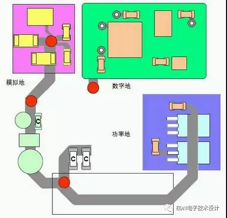 如果不選擇使用整個平面的作為公共的地線,比如模塊本身有兩個地線的時候,就需要進(jìn)行對地平面進(jìn)行分割,這往往與電源平面有相互作用。注意以下的幾點原則: