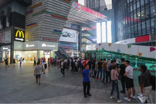 華為和蘋果同天發(fā)售新機的現(xiàn)場照片對比,更令人不甚感慨國貨崛起。