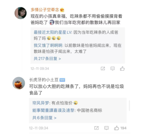 有網(wǎng)友回憶,小時候都是偷偷摸摸背著家長吃辣條,等味兒散完了才敢回家。