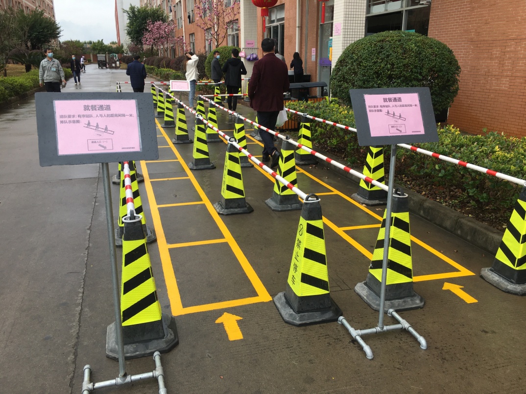 對人群集中的食堂、員工上下班打卡區(qū)用地標(biāo)線、錐形交通標(biāo)、警戒線、宣傳標(biāo)語規(guī)范員工排隊(duì)秩序;餐桌貼標(biāo)語與標(biāo)識,明確告知員工用餐就坐位置與面次,做到不聚群、不扎推。