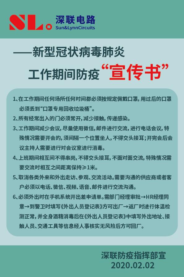 面對來勢洶洶的疫情時,贛州深聯(lián)電路疫情防控小組馬上響應(yīng)并建立了一套完整的疫情防控機(jī)制和管理方案,確保公司在復(fù)工生產(chǎn)過程中做到零風(fēng)險、零隱患,疫情可防、可控。