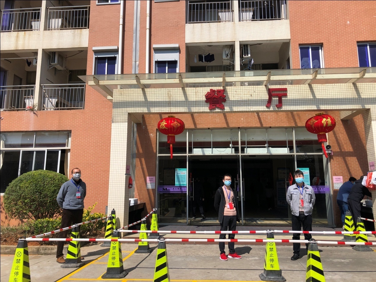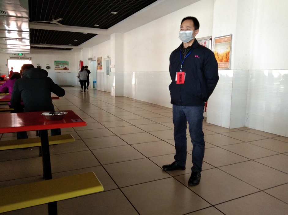 曾主管和陳主管參與防疫工作已將近大半個月了,他們主要負(fù)責(zé)生活區(qū)食堂和宿舍的防控稽查工作。曾主管給人最深的印象是他的微笑,盡管帶著口罩,那微笑的感染力依舊給人一種親切和溫暖。