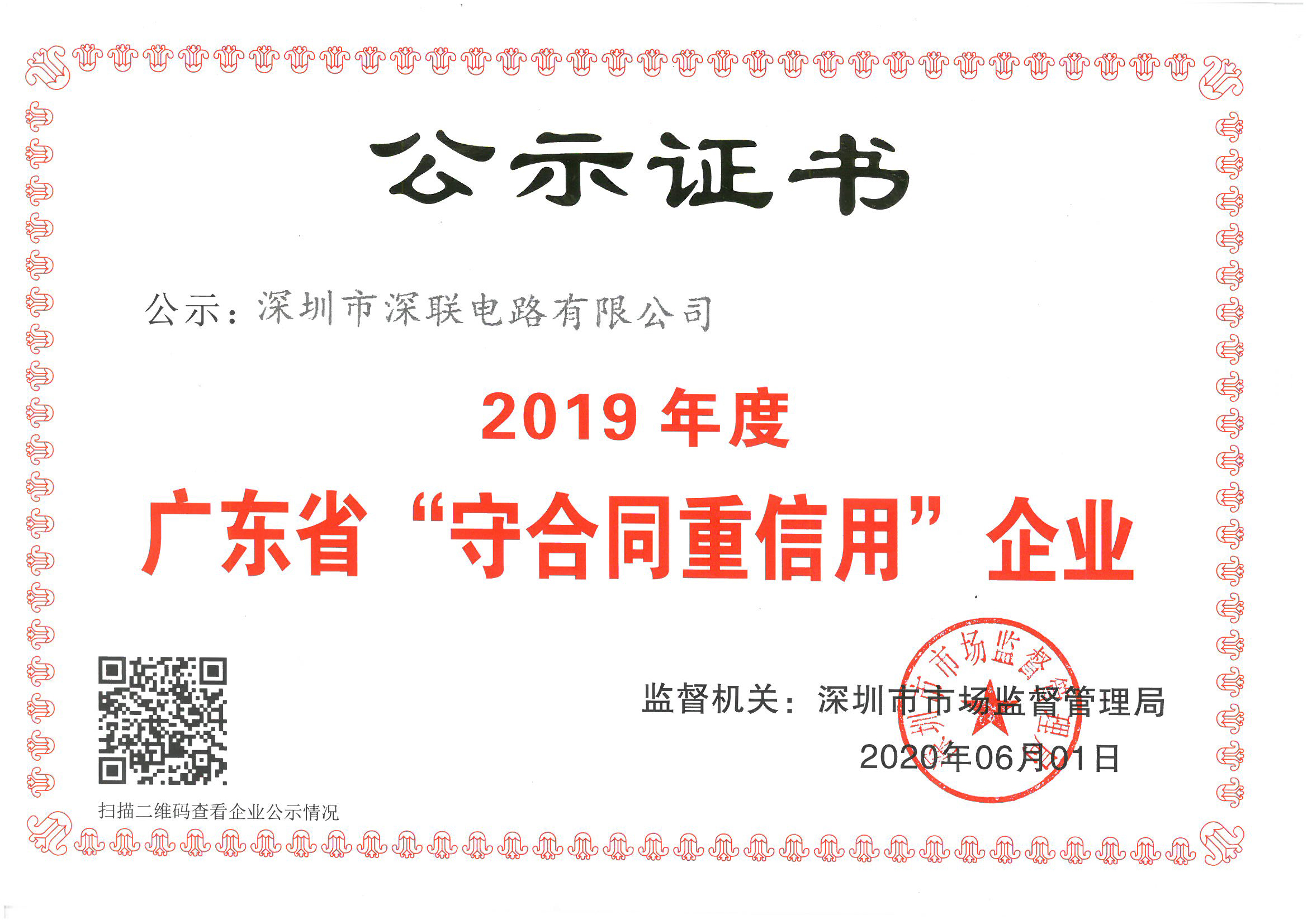 近日,深圳市深聯(lián)電路有限公司,被深圳市市場(chǎng)監(jiān)督管理局授予“2019年度廣東省守合同重信用企業(yè)”榮譽(yù)稱號(hào),成為全市同行業(yè)中獲此殊榮的佼佼者。
