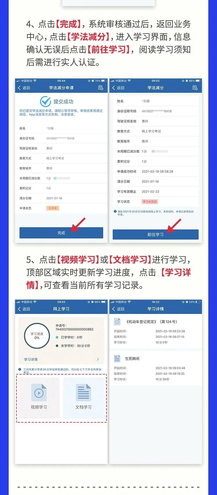 提交申請(qǐng)后,系統(tǒng)將自動(dòng)核查申請(qǐng)人是否符合學(xué)法減分的申請(qǐng)條件,申請(qǐng)結(jié)果將于24小時(shí)之內(nèi)通過(guò)“交管12123”手機(jī)APP消息方式告知,請(qǐng)注意及時(shí)查看申請(qǐng)審核情況。申請(qǐng)成功之日起,申請(qǐng)人需在3日內(nèi)完成累計(jì)30分鐘的交通安全知識(shí)學(xué)習(xí)(連續(xù)學(xué)滿5分鐘的,才計(jì)入累計(jì)學(xué)習(xí)時(shí)間),否則申請(qǐng)信息和學(xué)習(xí)記錄自動(dòng)作廢。