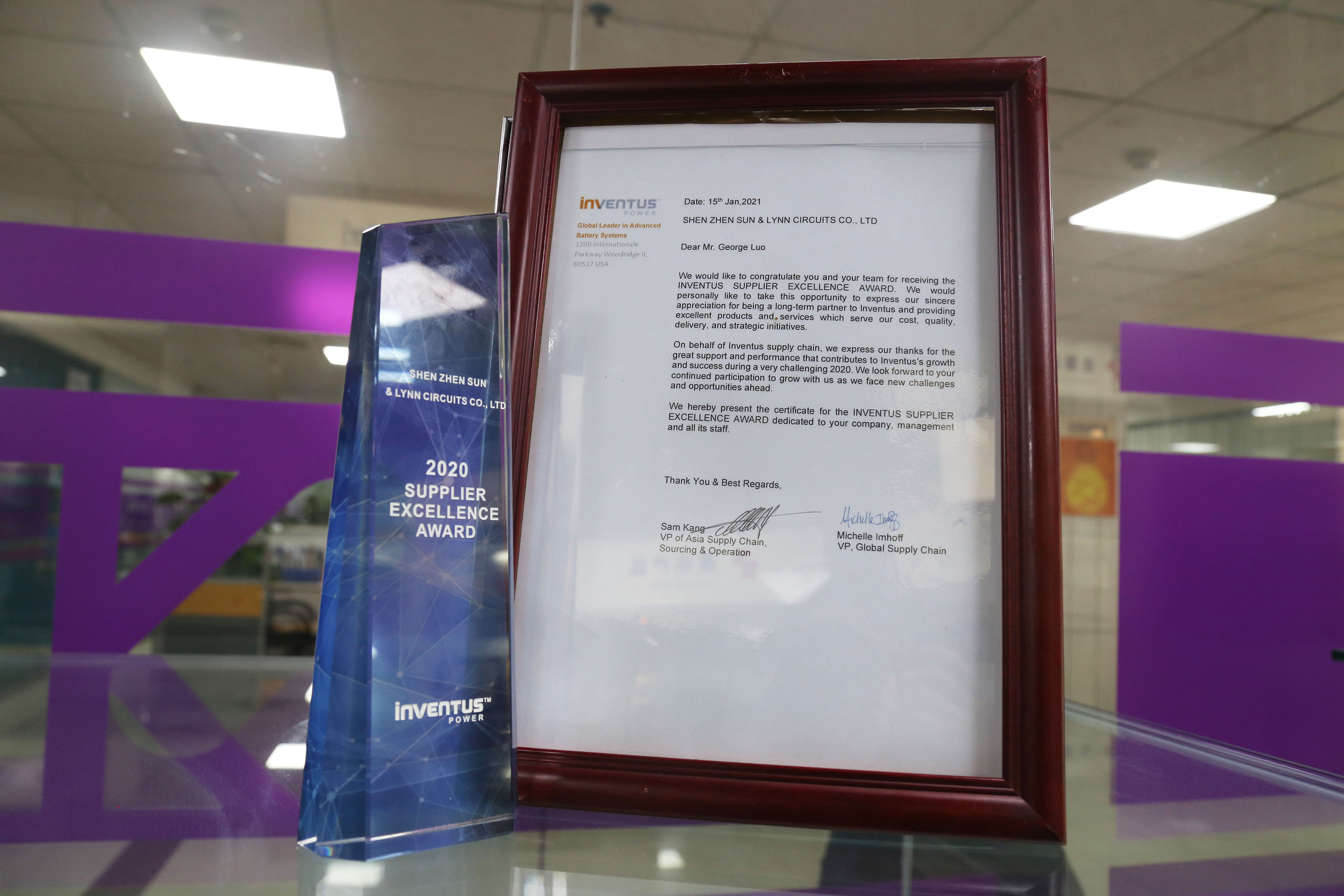 近日,深聯(lián)電路榮獲Inventus Power公司2020年度“優(yōu)秀供應(yīng)商”榮譽稱號!