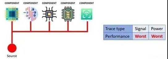 星型連接通常用于帶有各種時(shí)鐘的復(fù)雜高速信號(hào)板。在高速信號(hào)PCB中,信號(hào)通常來自邊緣,然后到達(dá)中心。所有信號(hào)都可以從中心傳到電路板的任何區(qū)域,并且區(qū)域之間的延遲 。