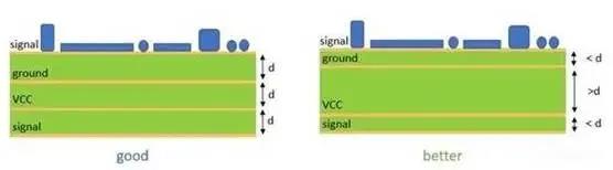 電源平面縮短了接地路徑,降低了電感,提高了電磁兼容性(EMC)性能。還應(yīng)歸功于,兩側(cè)的電源平面還會(huì)產(chǎn)生一個(gè)平行板去耦電容器,從而防止了噪聲傳播。