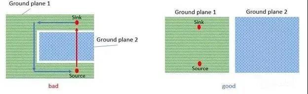 下圖顯示了兩個(gè)分開的接地平面的示例。在左側(cè),返回電流無法沿著信號(hào)走線直接通過,因此會(huì)出現(xiàn)環(huán)路區(qū)域,而不會(huì)在右側(cè)環(huán)路區(qū)域進(jìn)行設(shè)計(jì)。