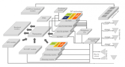 射頻前端模塊通常存在三種主流架構(gòu):PAMiD架構(gòu)、MMMBPA+ASM架構(gòu)、MMPA + TxFEM架構(gòu),對應(yīng)了不同形式的模組化。MMMB PA集成2G/3G/4G PA,通過外部濾波器和雙工器與天線開關(guān)模塊ASM連接,即MMMB PA+ASM架構(gòu);MMPA+TxFEM是目前國內(nèi)應(yīng)用最廣泛的射頻前端架構(gòu),MMPA只集成3G/4G PA,2G PA與ASM集成,稱為“TxFEM”。PAMiD集成度最高,集成了MMMB PA+ FEMiD。主流的旗艦機型因為要支持全球大部分頻段,大都采用PAMiD架構(gòu)。