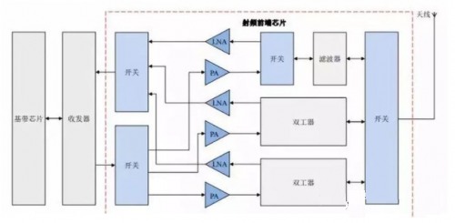 按照組成器件可分為功率放大器(PA)、低頻噪聲放大器(LNA)、濾波器(Filters)、開關(guān)(Switches)、雙工器(Duplexes)和調(diào)諧器(Antenna Tuner)組成。