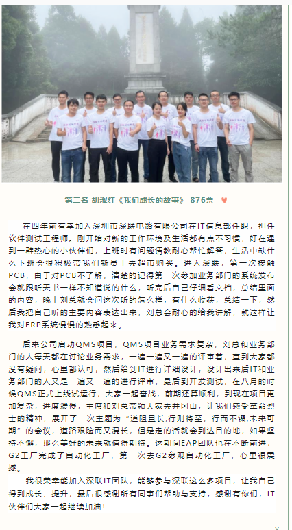 在“一張照片,說(shuō)出你和深聯(lián)HDI廠(chǎng)的故事”投稿中,有來(lái)深聯(lián)10年的,有在深聯(lián)5年的,有2年的....,他們用文字講述了他們?cè)谏盥?lián)的成長(zhǎng)過(guò)程以及那些難忘的時(shí)刻。他們的故事就是4000深聯(lián)人的一個(gè)縮影,深聯(lián)人和深聯(lián)一起不斷成長(zhǎng),不斷創(chuàng)造屬于自己的故事。